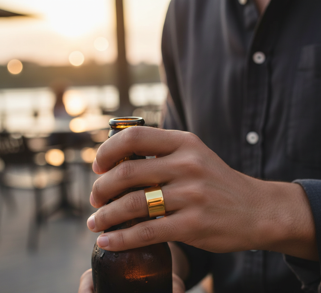 Ein robuster, breiter Bandring mit einer präzise eingearbeiteten Aussparung, die speziell als Flaschenöffner konzipiert wurde.